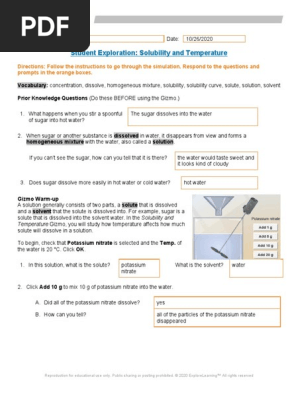 We can report the solubility of a chemical at various temperatures. Plants use a green pigment called chlorophyll to absorb light. Add varying amounts of a chemical to a beaker of water to create a solution, observe that the chemical dissolves in the water at first, and then measure the concentration of the solution at the saturation point. In the solubility and temperature gizmo™, you will study how temperature affects how much solute will dissolve in a solution. Concentration, dissolve, homogeneous mixture, solubility, solubility curve, solute, solution, solvent prior knowledge questions (do these before using the gizmo.) [note: You will use the calorimetry lab gizmo to determine the specific heat capacities of various substances. Add varying amounts of a chemical to a beaker of water to create a solution, observe that the chemical dissolves in the water at first. The purpose of these questions is to activate prior knowledge and get. .ib chemistry lab report design example— effect of temperature on solubility of potassium chloride in water research question how does temperature affect the solubility of potassium chloride in water? Many salts show a large increase in solubility with temperature. Heat is required to break the bonds holding the molecules in the solid together. The solubility of a given solute in a given solvent typically depends on temperature. Of the water is 20 °c.