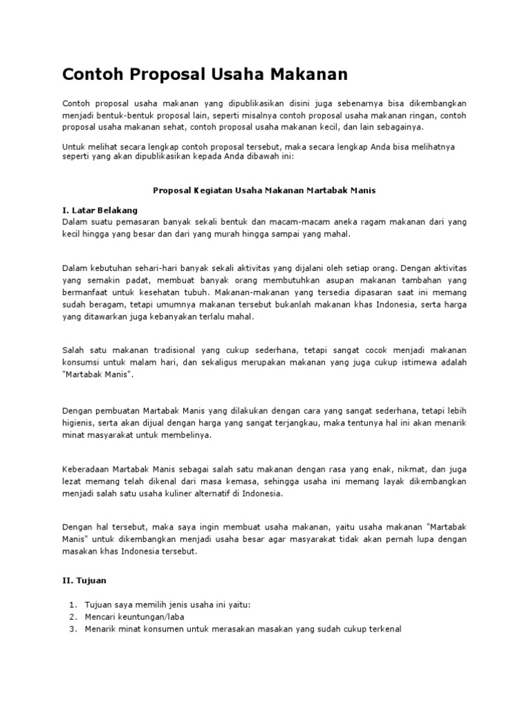Proposal Usaha Makanan : Contoh Proposal Usaha Makanan Pdf Contoh Proposal Usaha Makanan Proposal Usaha Bakwan Hungaria Cita Rasa Kentang Indonesia. Agar kamu dapat merencanakan usaha dengan matang, ada baiknya kamu pelajari dulu cara membuat proposal khususnya produk makanan. Menciptakan lapangan kerja sendiri 2. Pada umumnya, peluang dan deskripsi bisnis menjadi pokok penting yang perlu dijelaskan dengan singkat dan jelas. Produk makanan ini juga diberi tambahan coklat lumer dari cokelat batang yang dipanaskan. Perencanaan yang harus anda lakukan sebelum memulai bisnis idealnya adalah membuat proposal usaha.